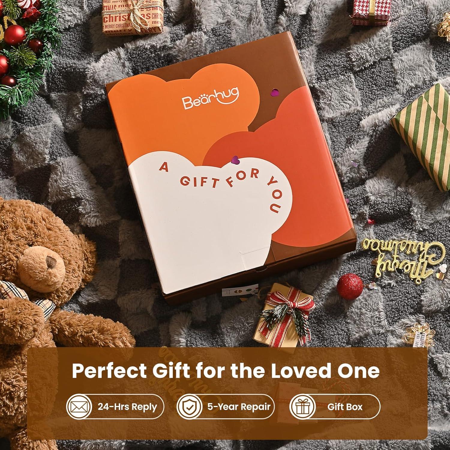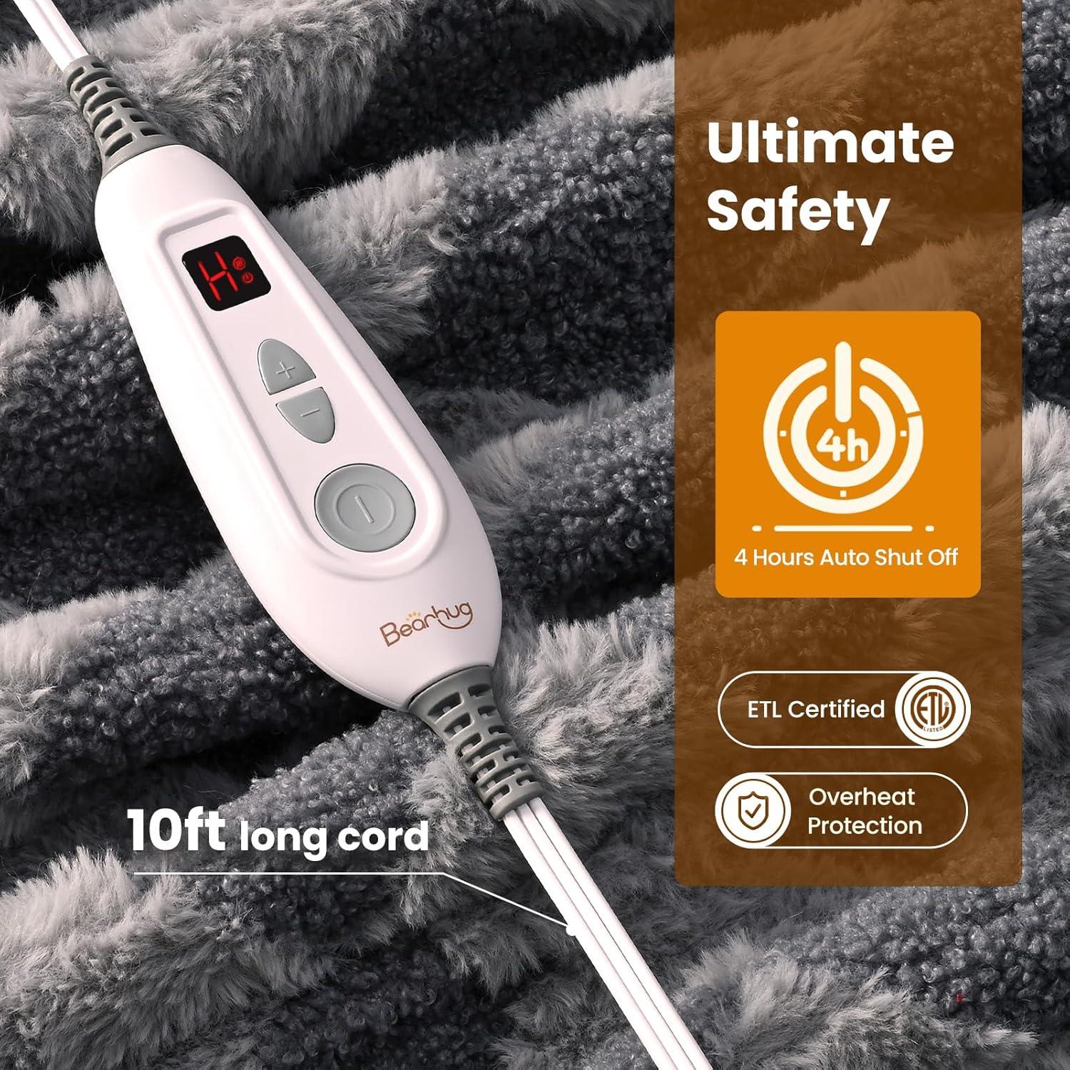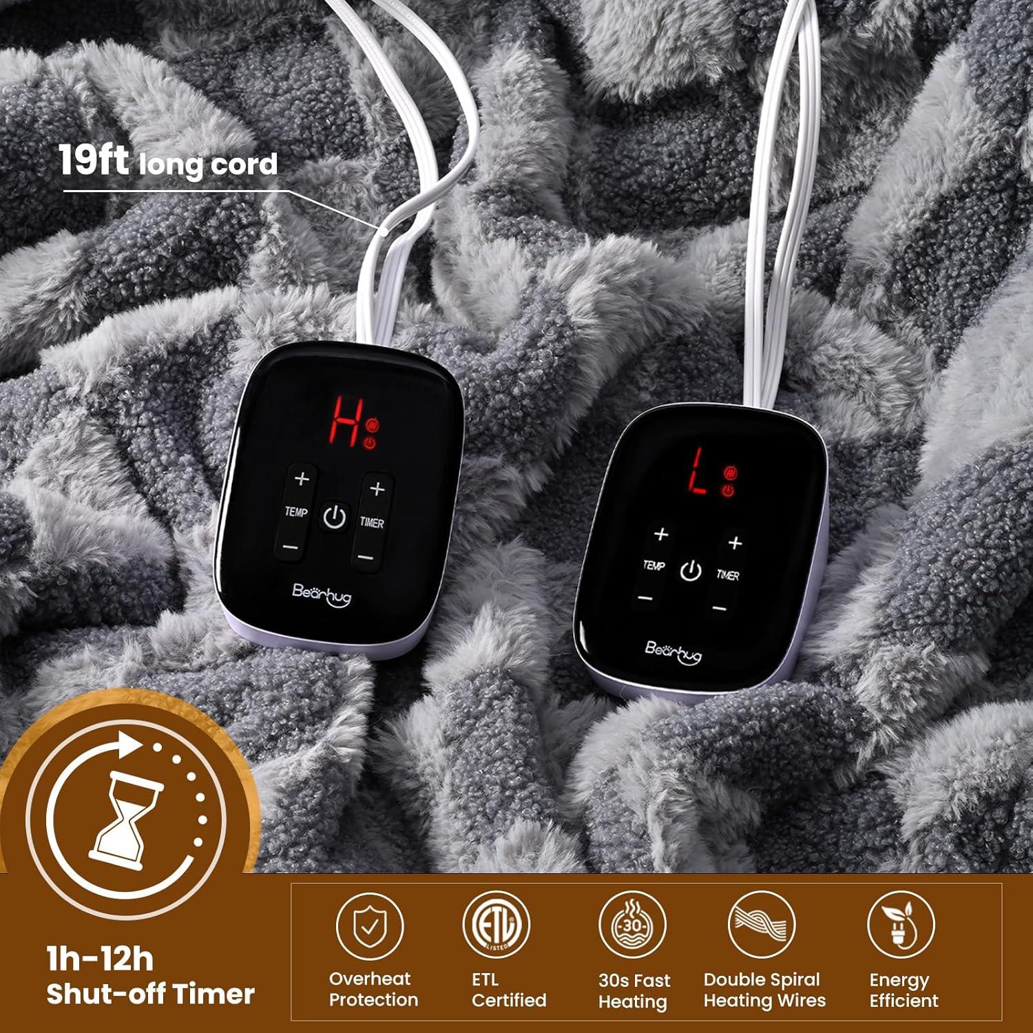 [Dual Independent Heating Zones for Personalized Comfort] The Bearhug heated blanket features dual heating zones, allowing you to customize your warmth with 10 temperature settings (90°F-108°F).