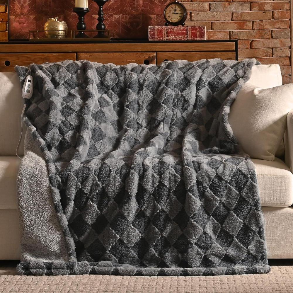 Bearhug Heated Throw Blanket, 50″×60″ Electric Throw, Grey Flower Patterns Faux Fur & Warm Sherpa, 4h Auto-Off Timer & 6 Heating Levels,ETL Certified, Machine Washable, Gift Box(Chocolate)